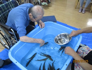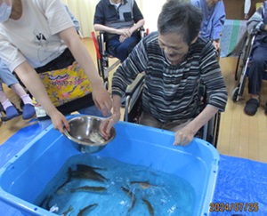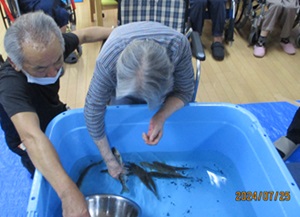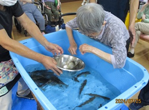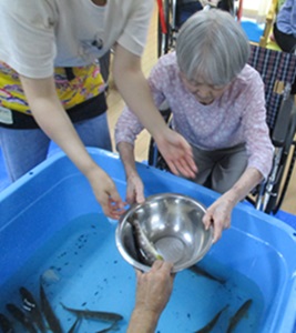 やまめの掴み取りでは実習生と入居者さんで一緒にやまめを掴んだ時の