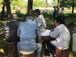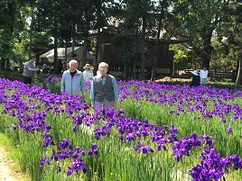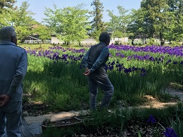 町内の方が大切に育てておられる、今が見頃のあやめを見ながら一休み