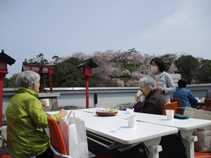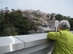 津山信用金庫のビルの屋上から見上げる鶴山公園の桜は