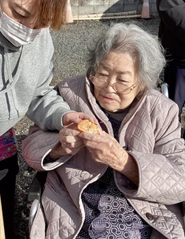 今回はA棟B棟の利用者様を代表して、N様とM様がみかんを焼いてくださいました。香ばしい匂いが漂う中、出来上がったほかほかの焼きみかんを皆様でいただき、今年1年の無病息災をしっかりとお願いしました。