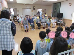 子どもたちの歌や手遊びに合わせて、歌ったり、手拍子をしたり