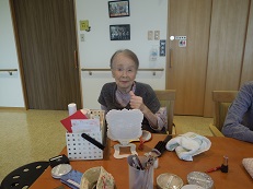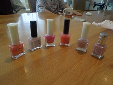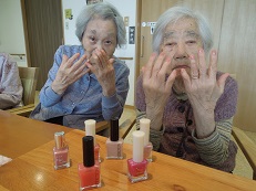 マニキュアを塗ると、一気に表情が明るくなり、「そっちの色もいいわね」と笑顔。