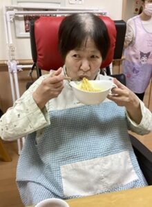 職員が「今日のおやつにしましょう!」とミニのカップヌードルを用意しました!