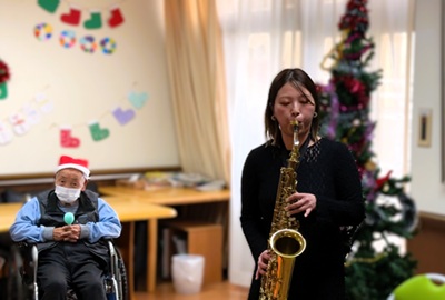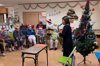 午後はサックスの音に合わせて鈴やマラカスを振り、クリスマスソングを演奏♫