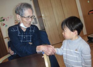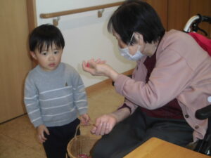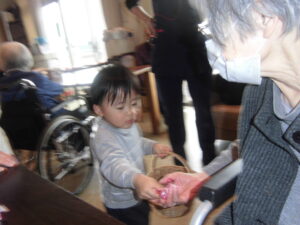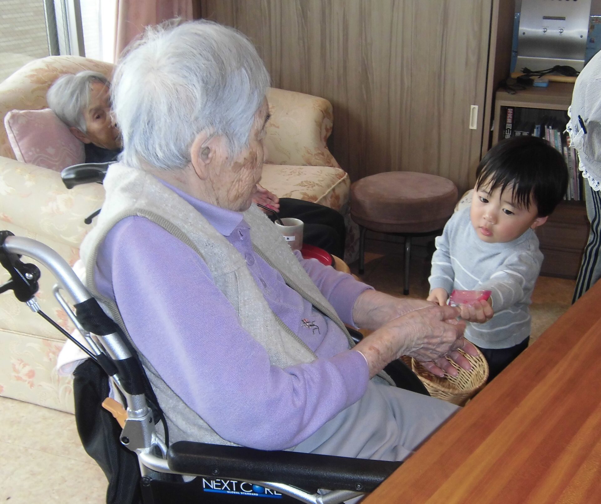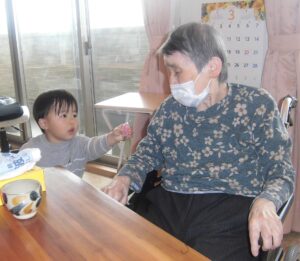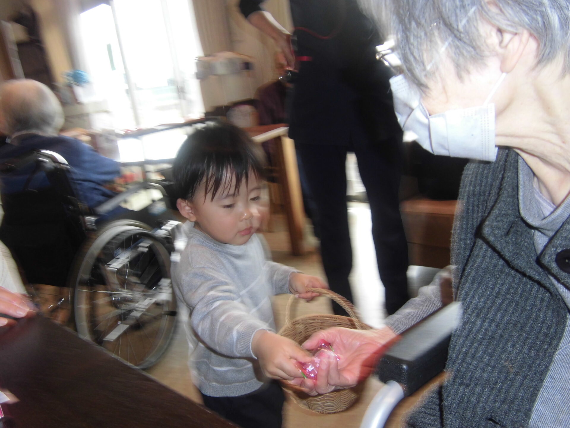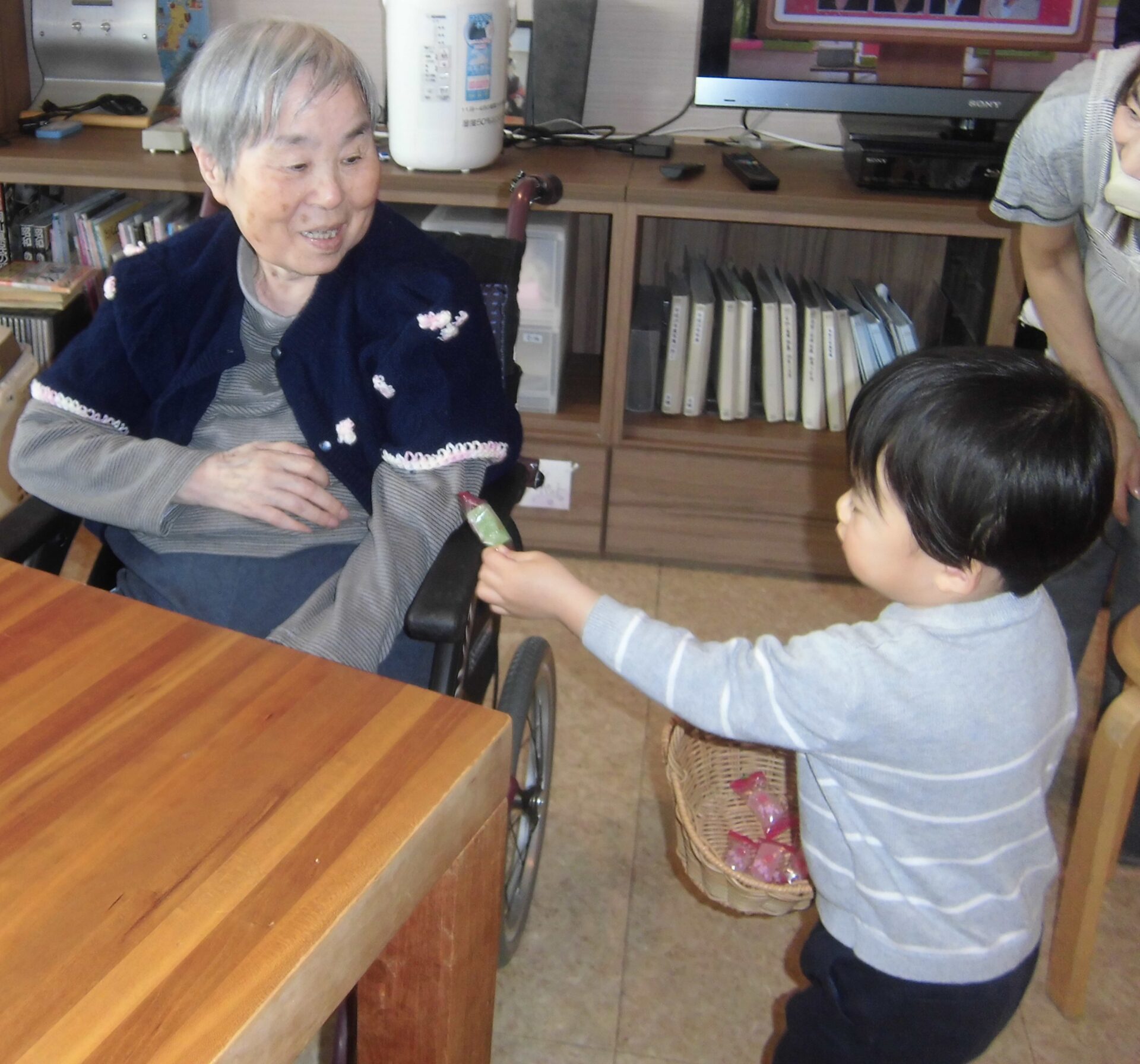 もうすぐ3歳になるFくんが、照れながら ご入居者様に飴を「どうぞ❣」と手渡すと「ありがとう💛」とご入居者様は満面の笑顔☺