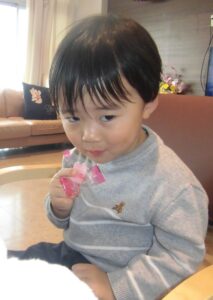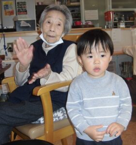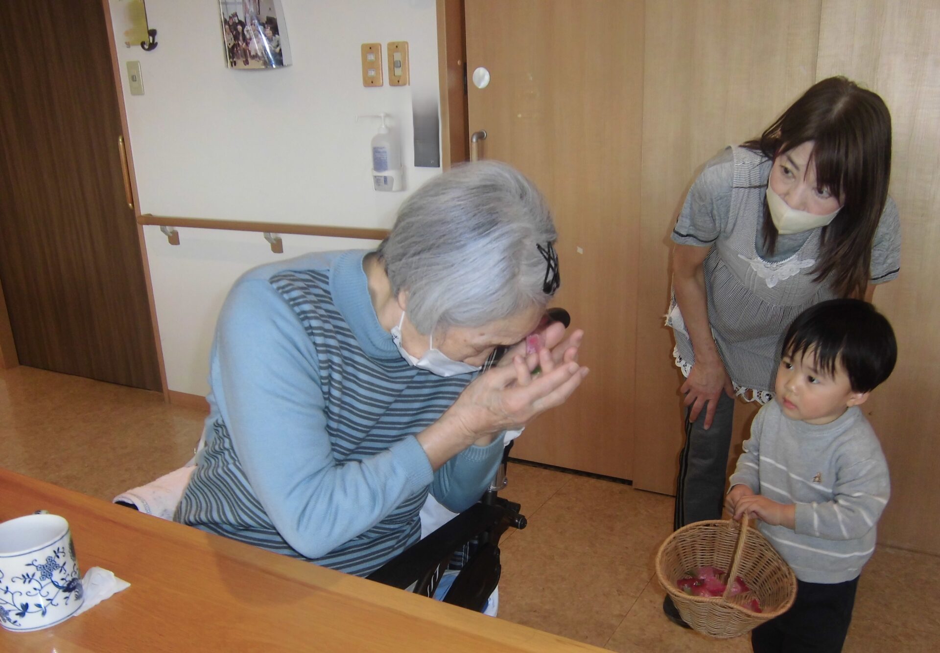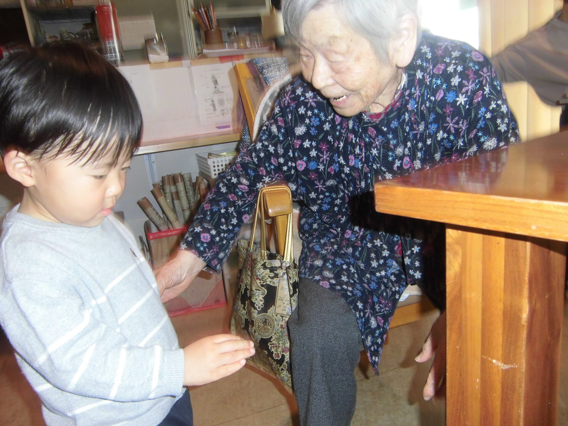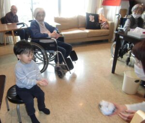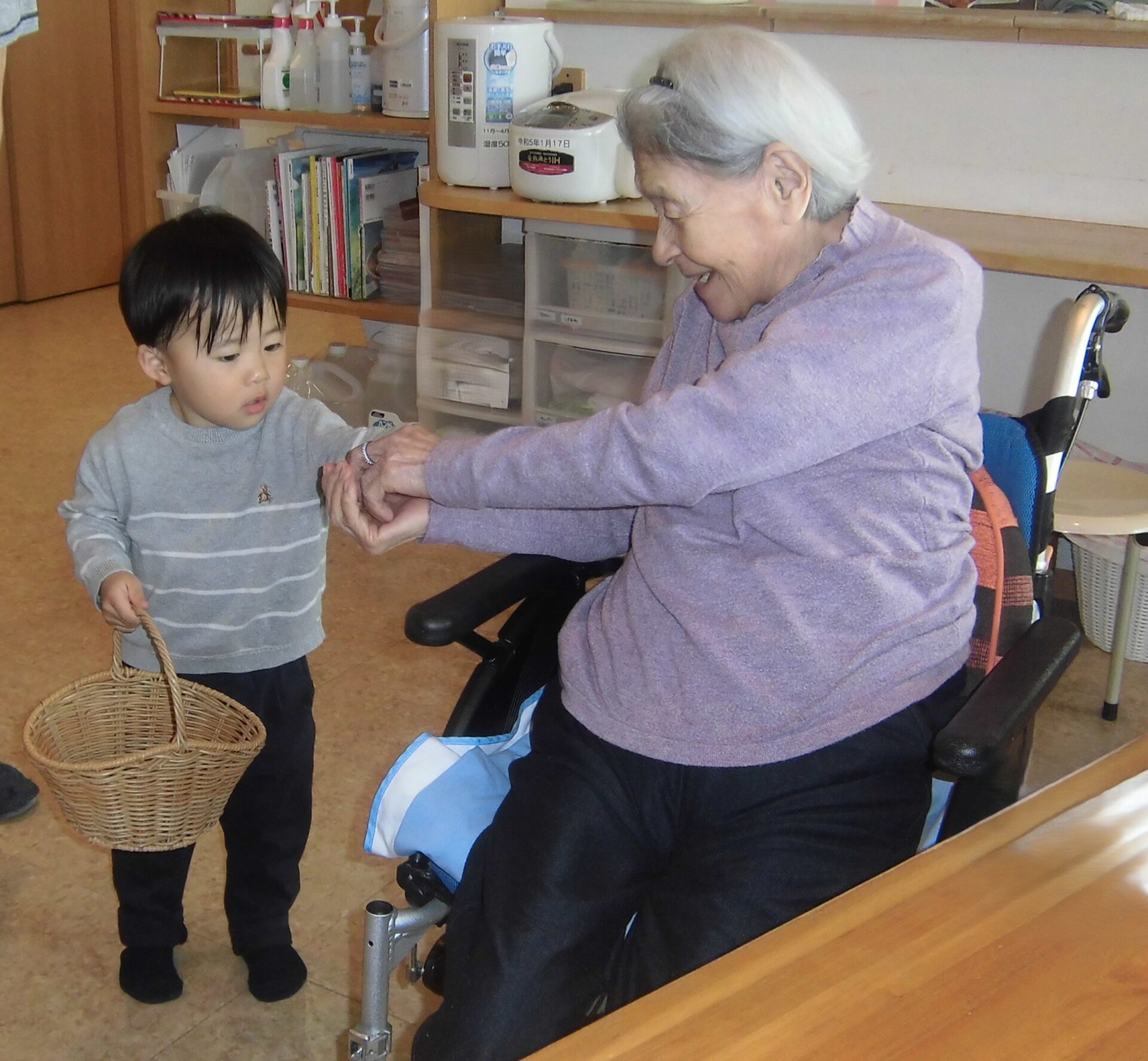 もうすぐ3歳になるFくんが、照れながら ご入居者様に飴を「どうぞ❣」と手渡すと「ありがとう💛」とご入居者様は満面の笑顔☺