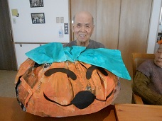 ホームでは大きなカボチャのオブジェを新聞紙で作りました♪