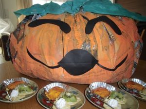 ホームでは大きなカボチャのオブジェを新聞紙で作りました♪