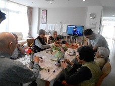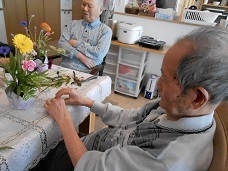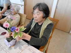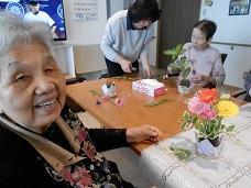 「今日は男性も参加してくださいね。」と声をかけて、興味津々に花を挿す男性入居者様。