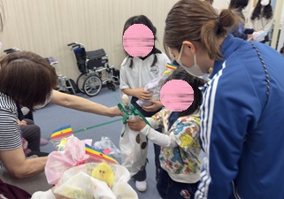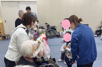 子供たちにお菓子を渡すと「ありがとう、ありがとう」と入居者さんの周りに集まり、