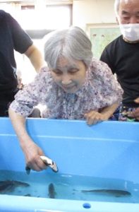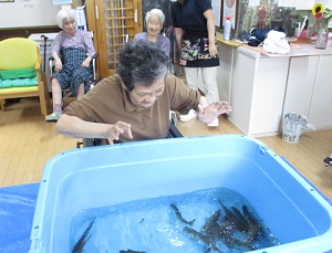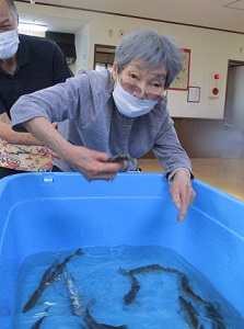 生きた魚を手でつかみ取ることで、昔懐かしい思いを呼び起こします。