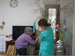 職員が飾りをつけていると、「右の方が少ない」「上にもつけたら?」「あ~ようなった」と