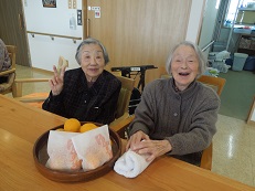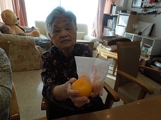 ゆずを手に取って香りをかいで「うわぁーいい香り」「今日は特別いいお湯ね」「ステキー!」笑顔いっぱいです。