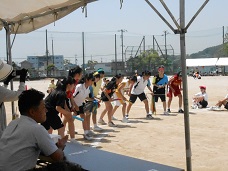 ちょうど1年生のラケットとボールを使ったリレー、2年生の二人三脚ならぬ30人31脚競争、部活動対抗リレーの競技中でした。