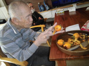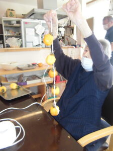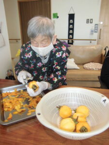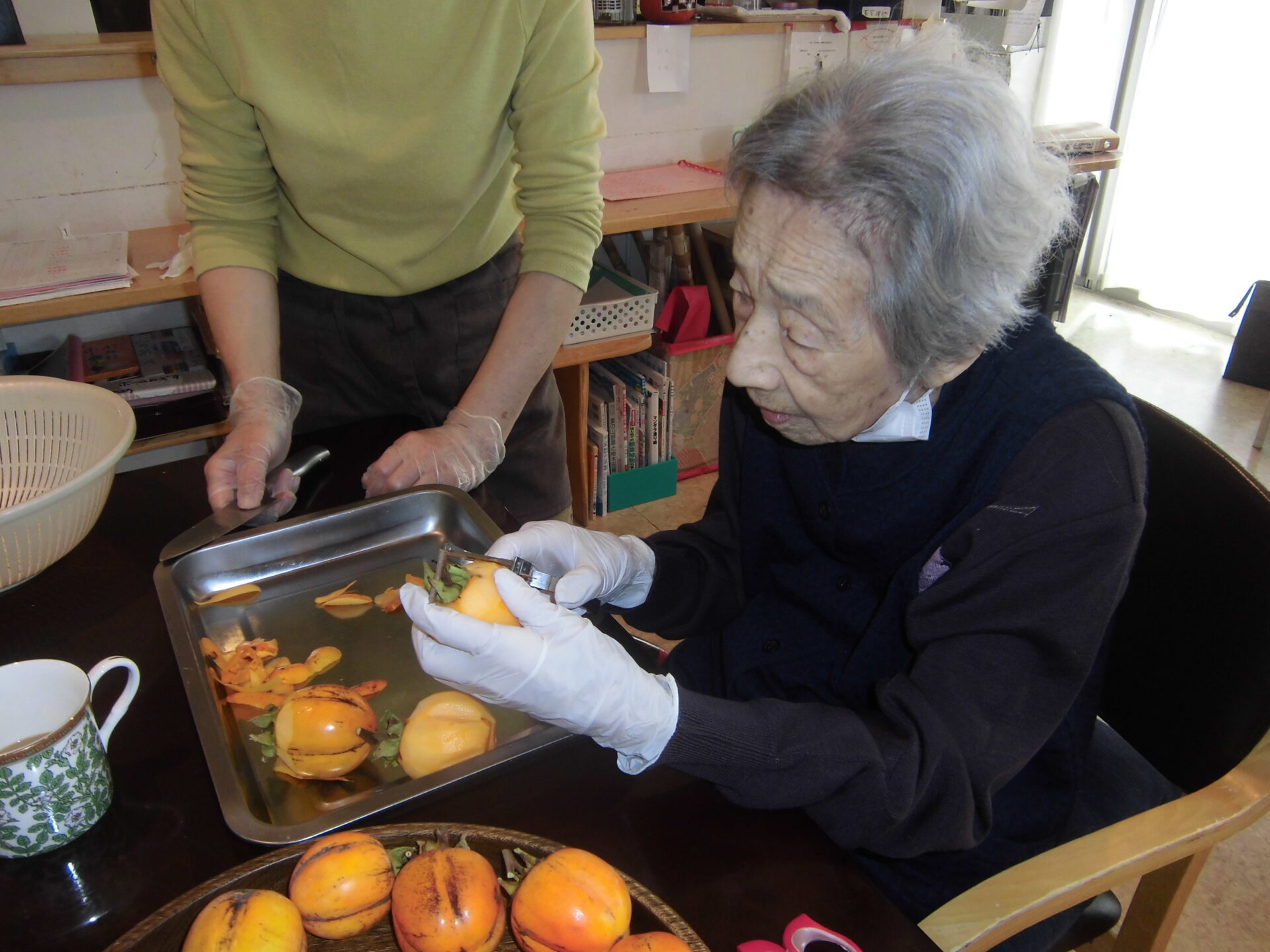 ピーラーで渋柿の皮をむいていただいたり、吊るす作業をしていただきました。