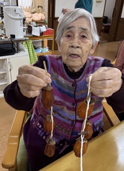 中庭に干していた干し柿が食べ頃になり、利用者様・職員・実習生の皆んなで試食しました。