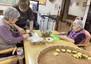 実習生の方々や20代の職員も参加し、利用者様から教わりながら、初めての干し柿・干し芋作りをしました。