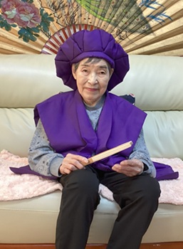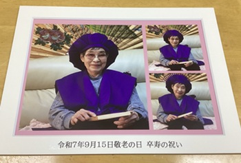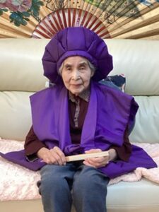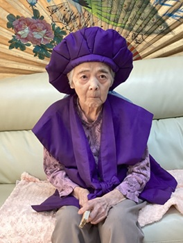 新入居の方が百寿(紀寿)になられ、お祝いに紫色のちゃんちゃんこを着ていただき記念撮影をしました。