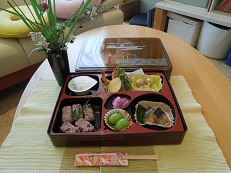 お祝い膳の準備、盛り付けより皆様心待ちにされ、「まあーごちそう!」と口々に言われ、ゆっくり味わい皆様ほぼ完食され喜んで頂けました。