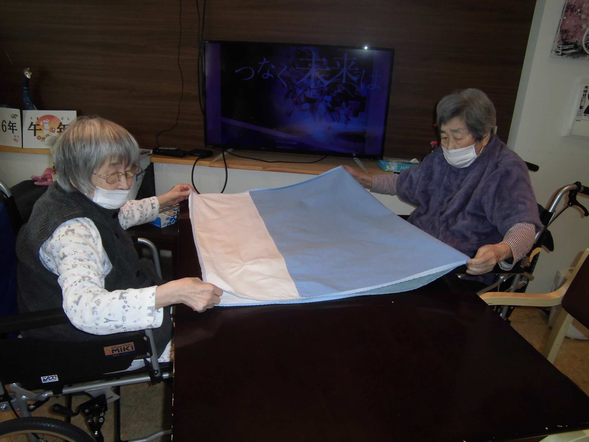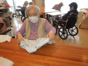 大きなシーツを2人で協力しながら「そっちもうちょっと引っ張ってくれる?」「こんな感じでえんかなぁ・・」などの会話をしながらのお手伝い。