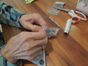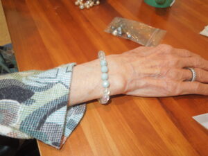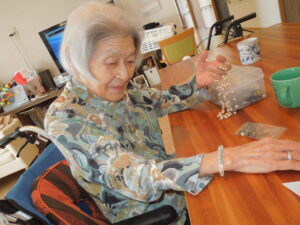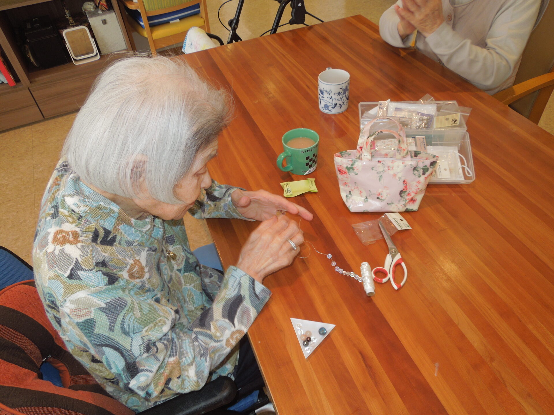 お洒落で指先が器用なO様、ビーズでブレスレット作り。どの色のどの形を使うかご自分で考えられて楽しそうに制作。