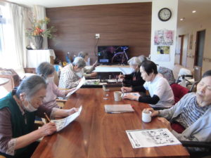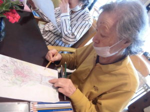 大人の塗絵をされています。皆様、お上手に塗られています。素晴らしい出来栄えです。