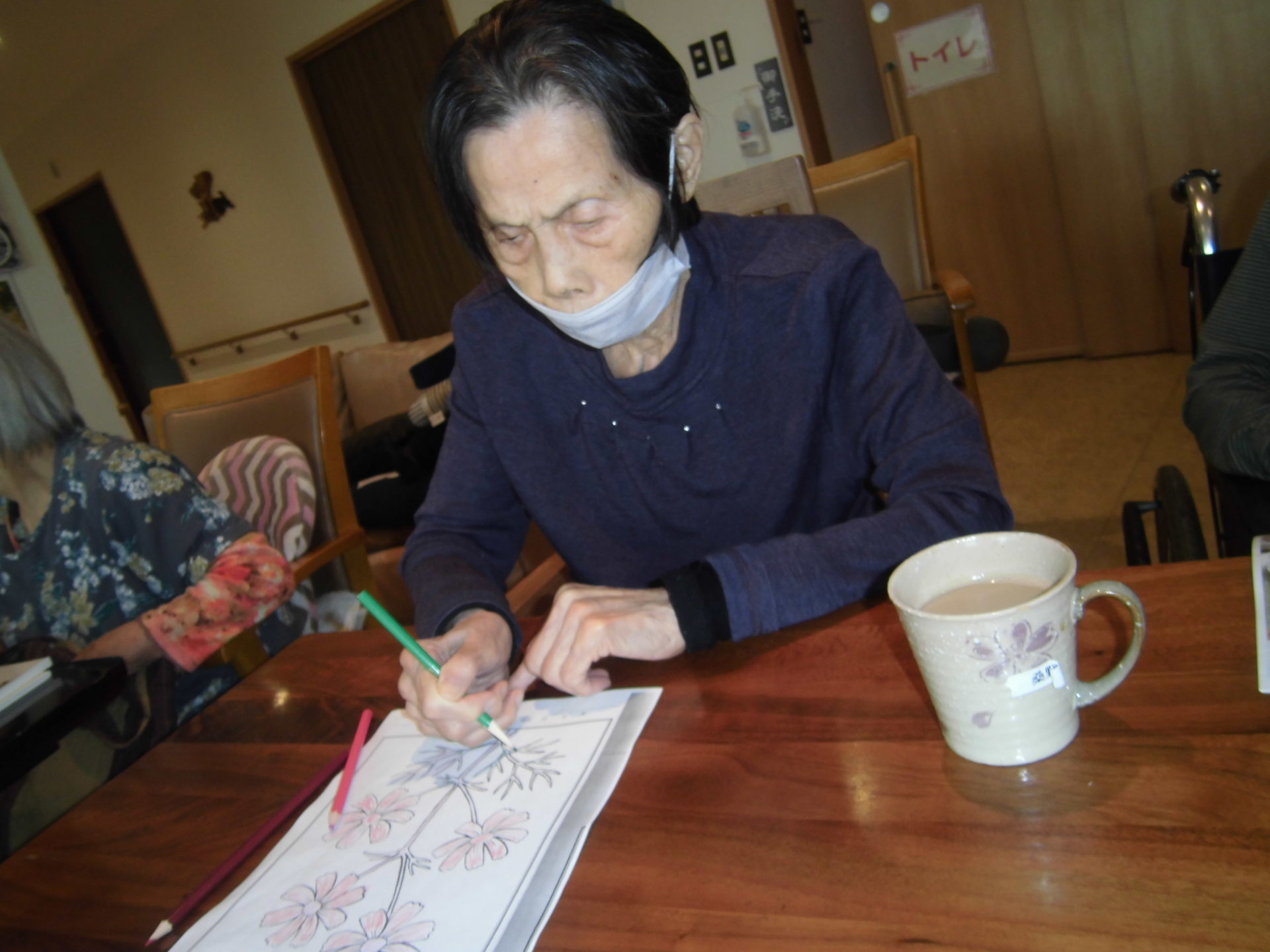 大人の塗絵をされています。皆様、お上手に塗られています。素晴らしい出来栄えです。
