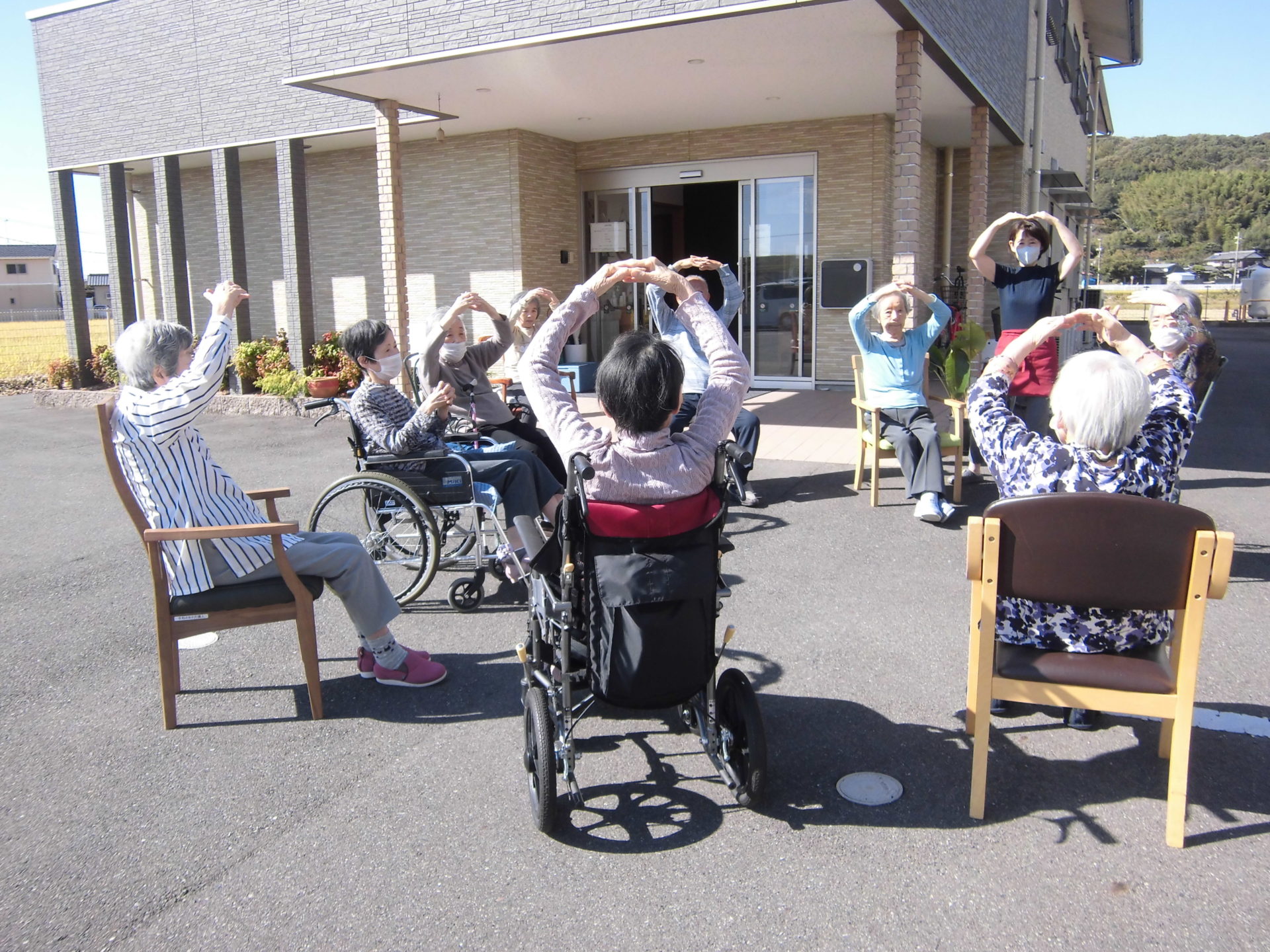 お天気のいい日には、庭で体操。とっても気持ちいいな~。
