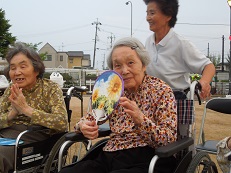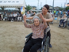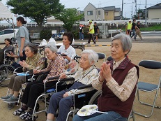 会場へ着くと、入居者様は自然と明るい表情となり、踊りの輪を見ながら一緒に踊りました。