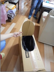 完成した簡易トイレにご利用者様に座ってもらうと「段ボールなのに座り心地ええわ~」