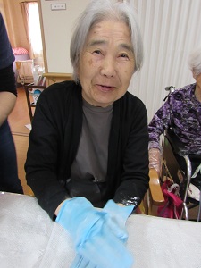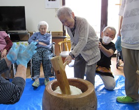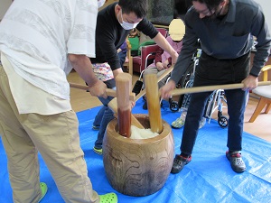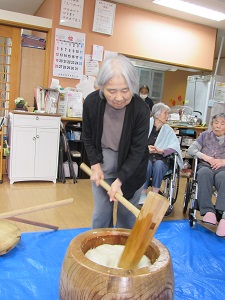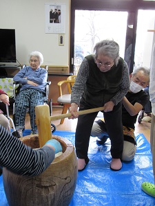 ご入居者さんも杵を持ち、立てる方も車椅子の方も自分の力で餅を搗きました。