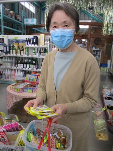 笑顔でカゴに沢山のお菓子を入れていました。