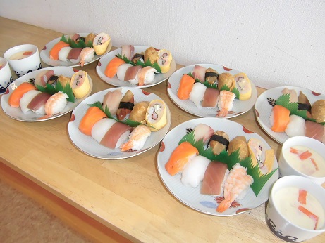 握り寿司と手作りケーキでお祝いしました。