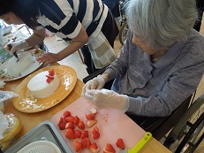 誕生日ケーキはN様と職員で果物カットと飾りつけを行い、手作りケーキでお祝いしました。