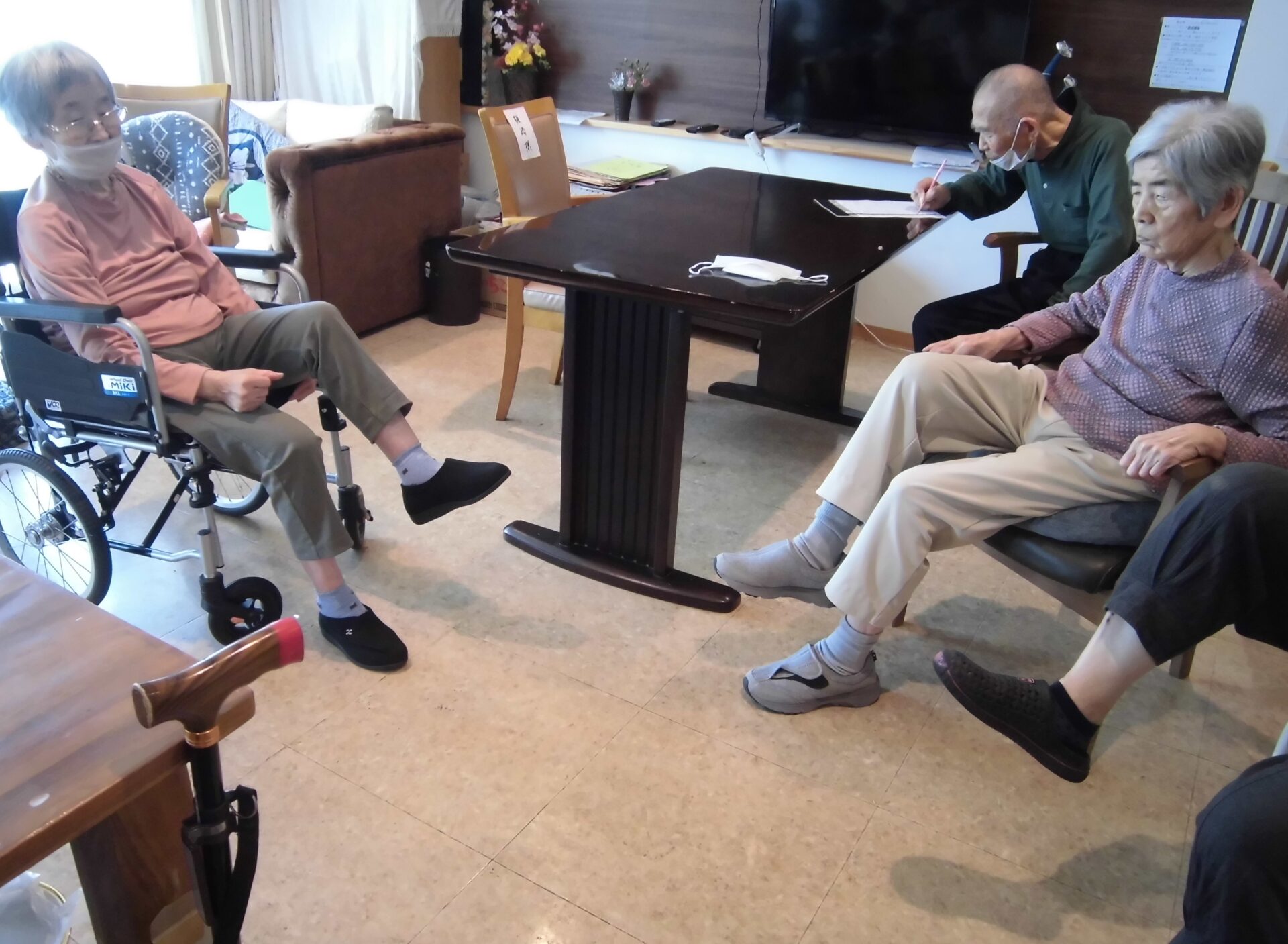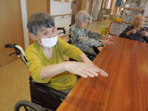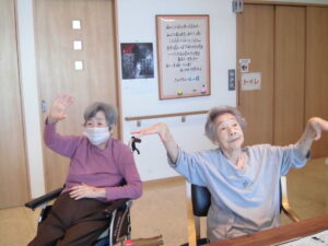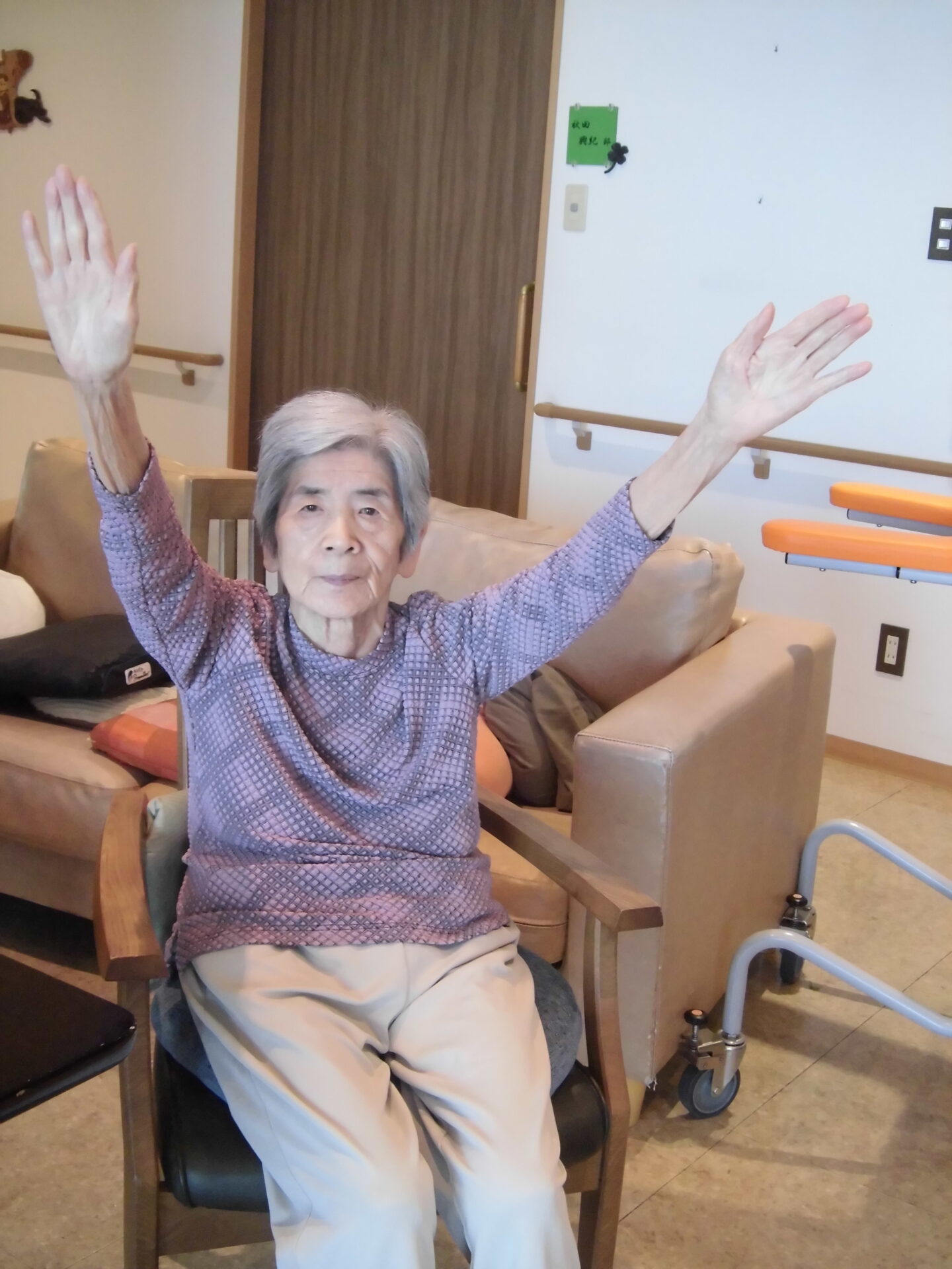 日課の体操、1.2.3・・と掛け声を出されながら「元気でおりたいもんなぁ」と日々頑張っておられます。