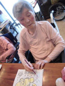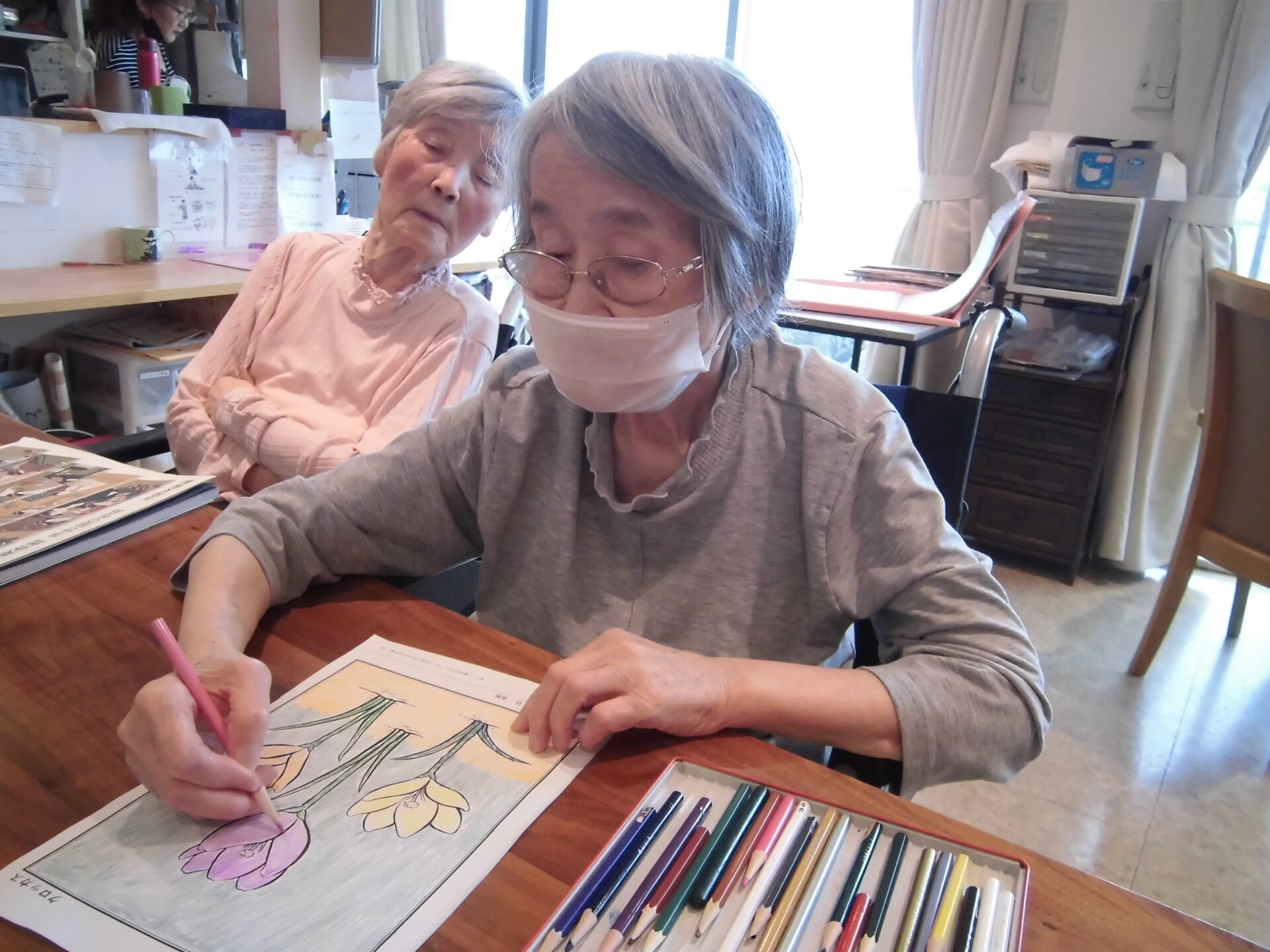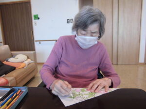 大人の塗り絵。お花に興味がある方が多く、皆様素敵な色彩感覚で丁寧に色塗りされています。