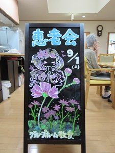 9/1 ご入居者様のご家族を招いて、恵老会(けいろうかい)を開催しました! 昼食は、バイキング形式で、お好きな物をお好きなだけ召し上がって頂きました。 料理を、お皿いっぱいに乗せているご入居者様・・・。 《そんなに食べれるのかな!? 大丈夫かなぁ?》と思い、ドキドキしながら見守っていたところ、 なん...